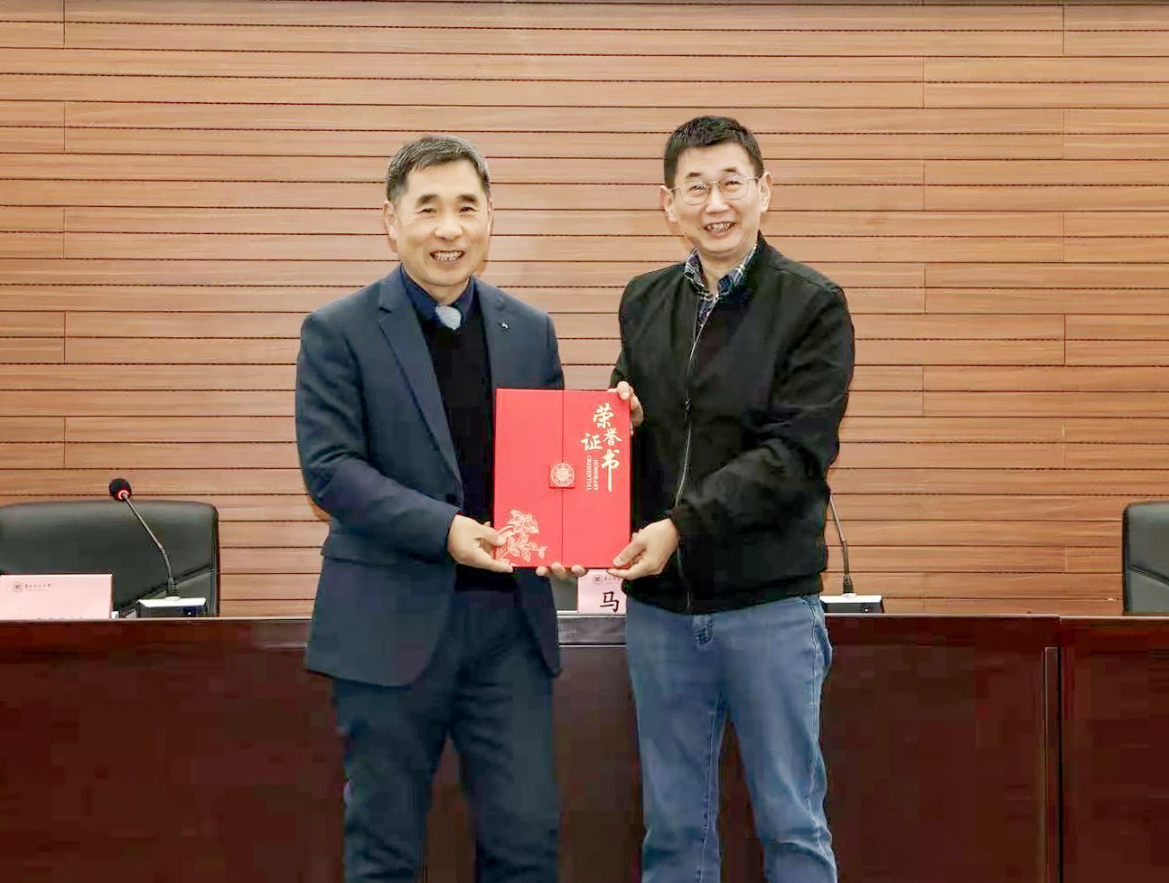 校长张绍东(右)为马军院士(左)颁发荣誉证书